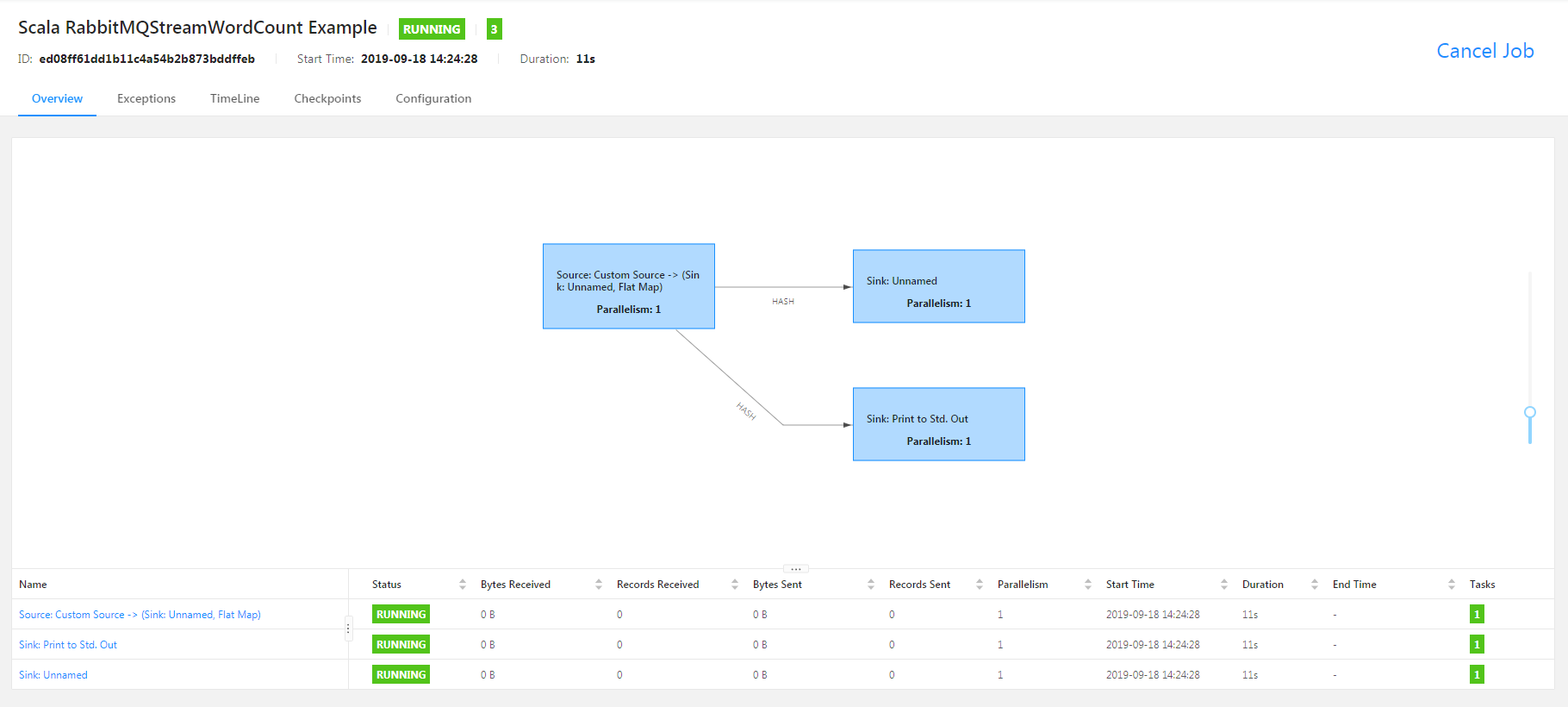 成功运行后可以在 Apache Flink Dashboard 中查看 Job 的状态,也可以手动取消任务。