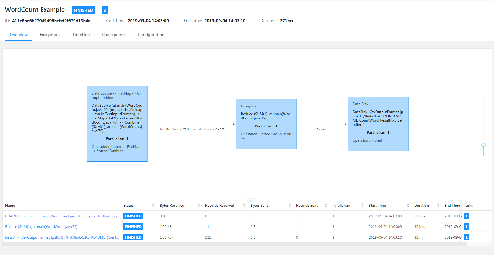 D:\flink\flink-1.9.0\bin>flink.bat run D:\flink\flink-1.9.0\examples\batch\WordCount.jar -input D:\flink\flink-1.9.0\README.txt -output D:\flink\flink-1.9.0\README_CountWord_Result.txt