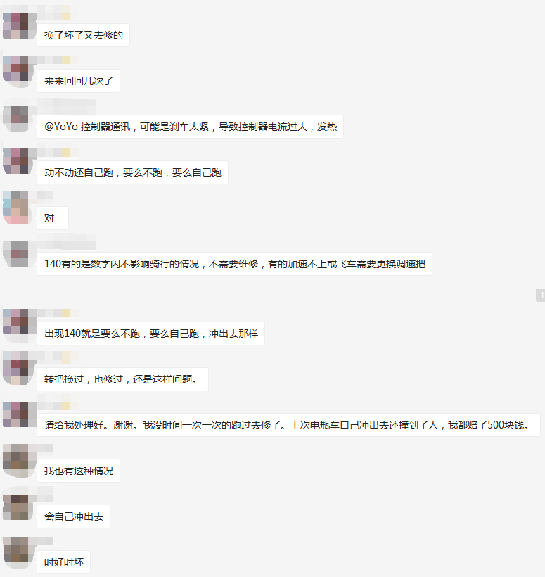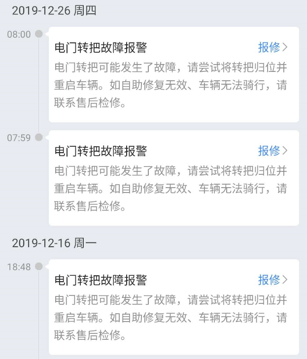 转把换过总共三次,提示说 电门转把故障,但是刚换过新的,很快就又有这个报警,到现在仍然还有,已经放弃了。(这个转把问题其实还是蛮恐怖的,看后面群里别人报修的截图)。