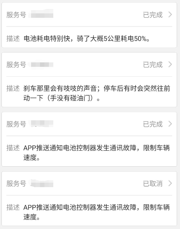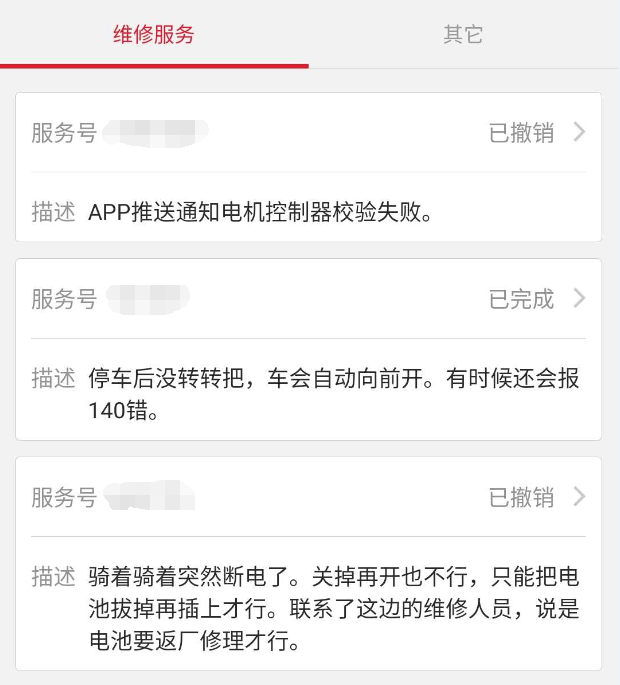 从第一年开始,这台车就小毛病不断,偶尔还会来个大毛病。 下面是我这台小牛的维修服务记录,大部分都是 17、18 年的了,第一年在质保期,维修都是免费的,之后就要自己再出钱了。期间电池返厂维修过一次,前轮的滑轮那里也换过一次,前把晃动的特别厉害去重新拆开安装了一次。